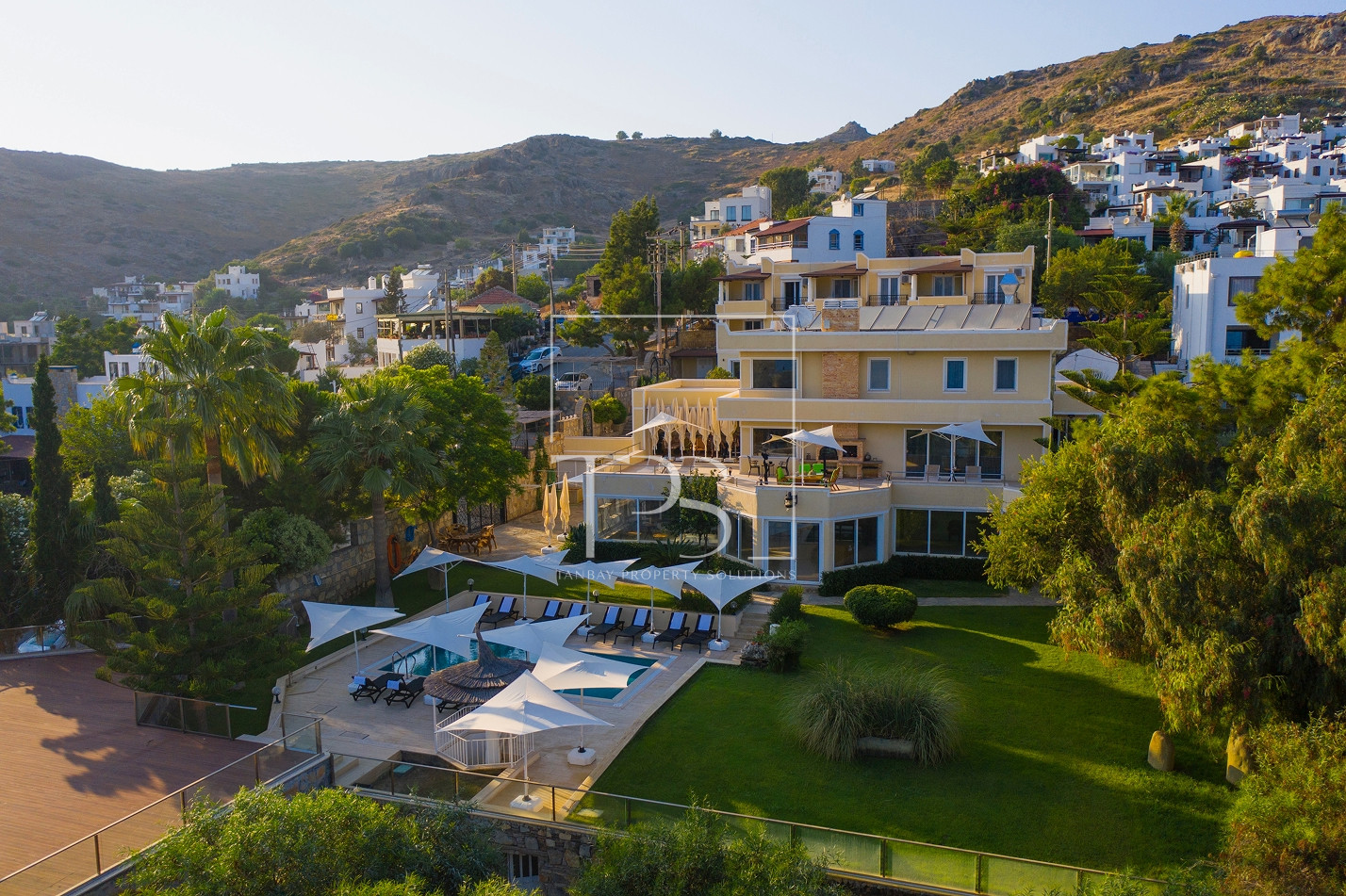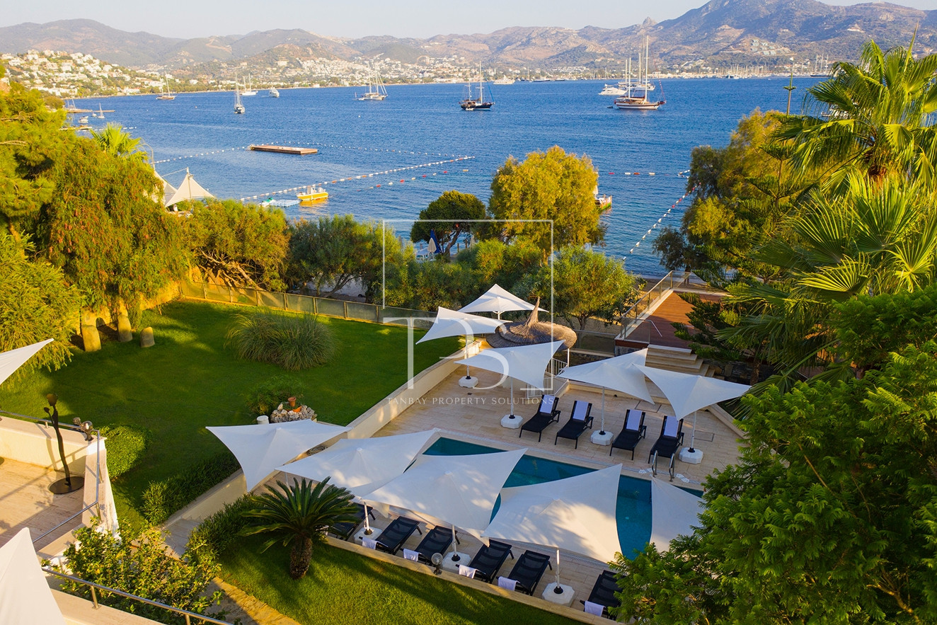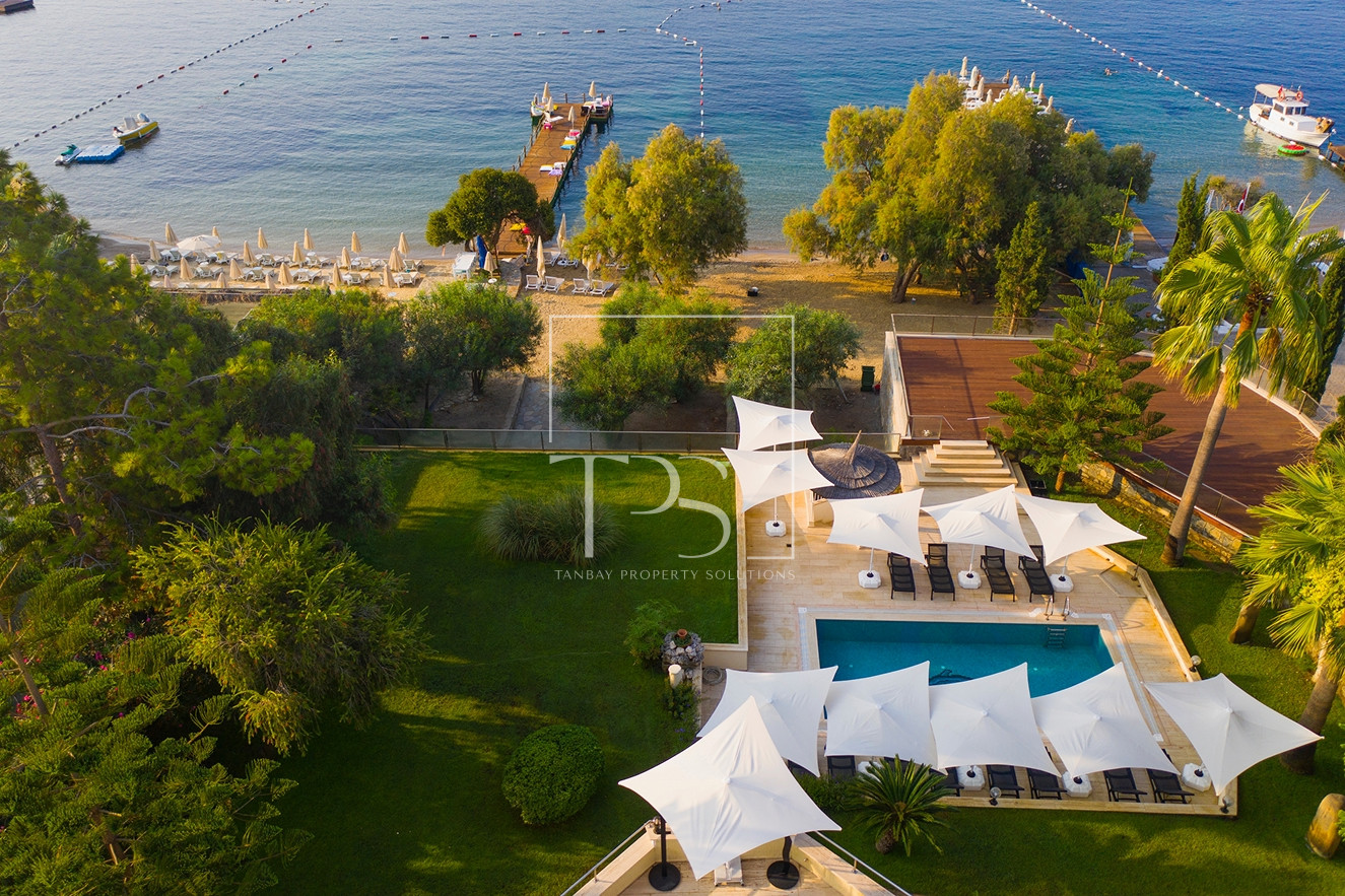 Seafront Estate in Yalikavak: Grand Villa with Pool, Garden, and Aparthotel with Direct Sandy Beach Access